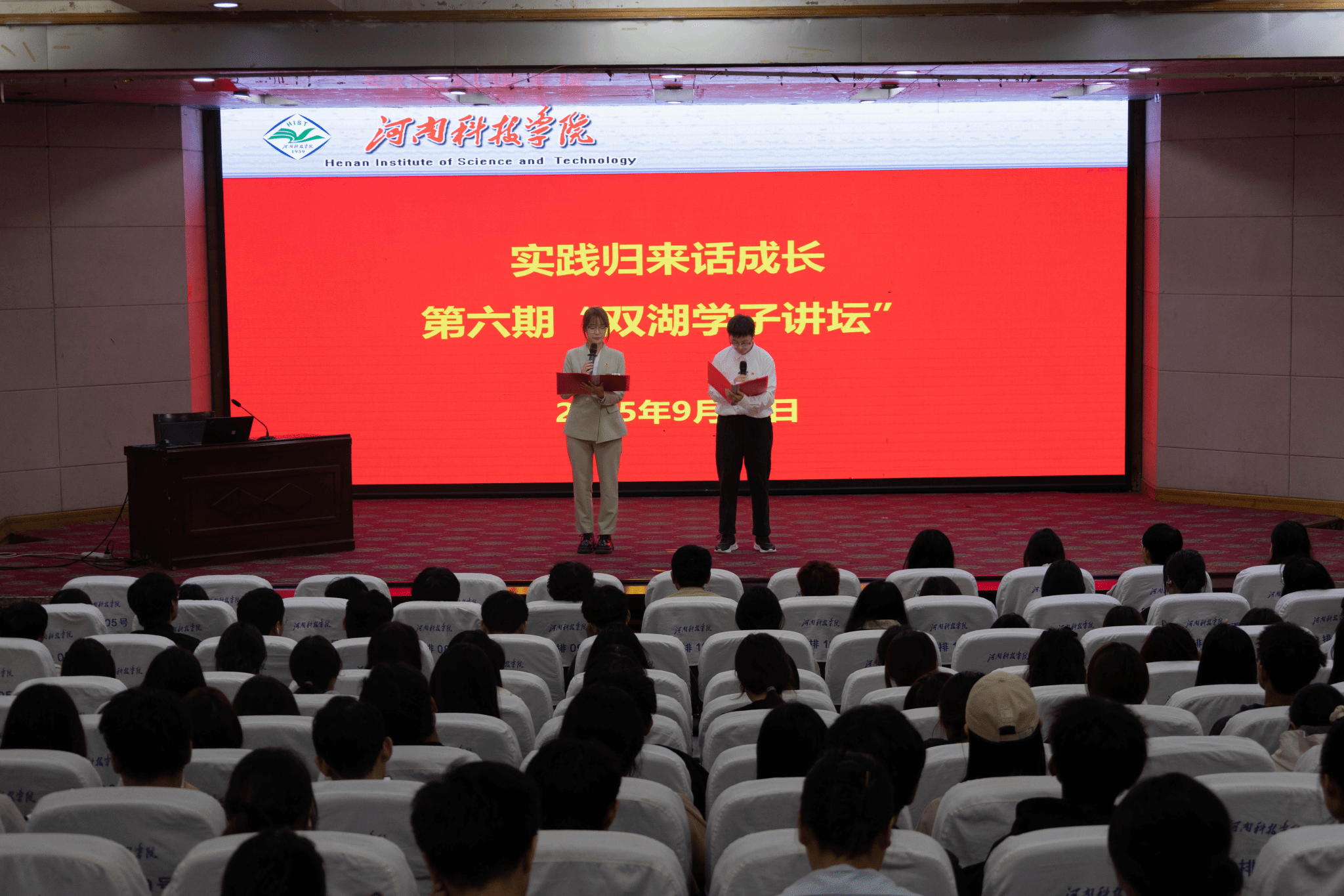 为加强社会实践活动的总结与交流,进一步凝练社会实践成果,推动社会实践活动项目化、规范化和长效化发展,9月23日晚,我校在图教201报告厅举办第六期“双湖学子讲坛”暨“实践归来话成长”分享会。活动邀请暑期社会实践校级重点团队负责人及“出彩中原”集中社会实践学生代表,上台分享他们在社会实践中的经历与感悟。各学院学生代表共300余人到场参加活动。