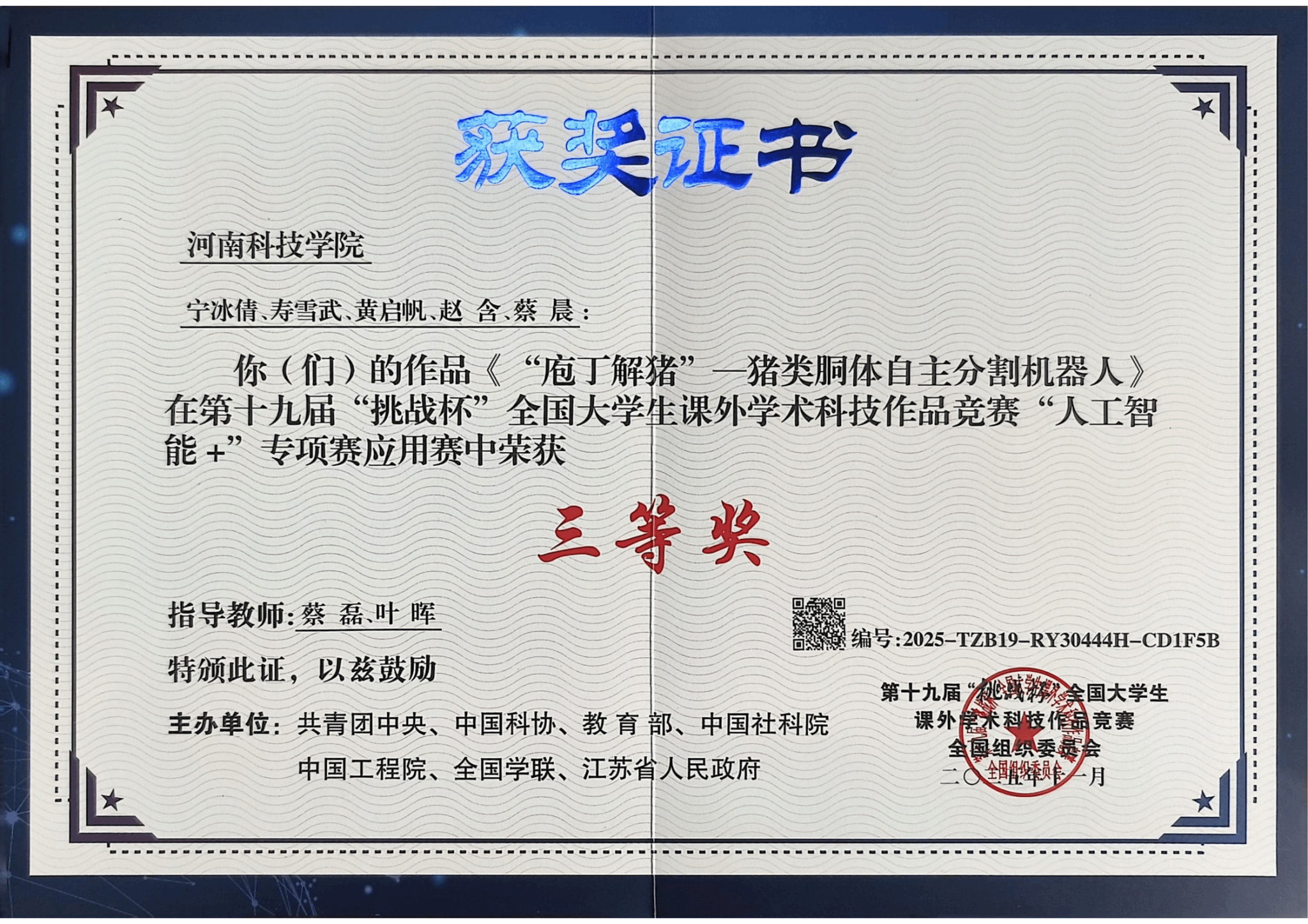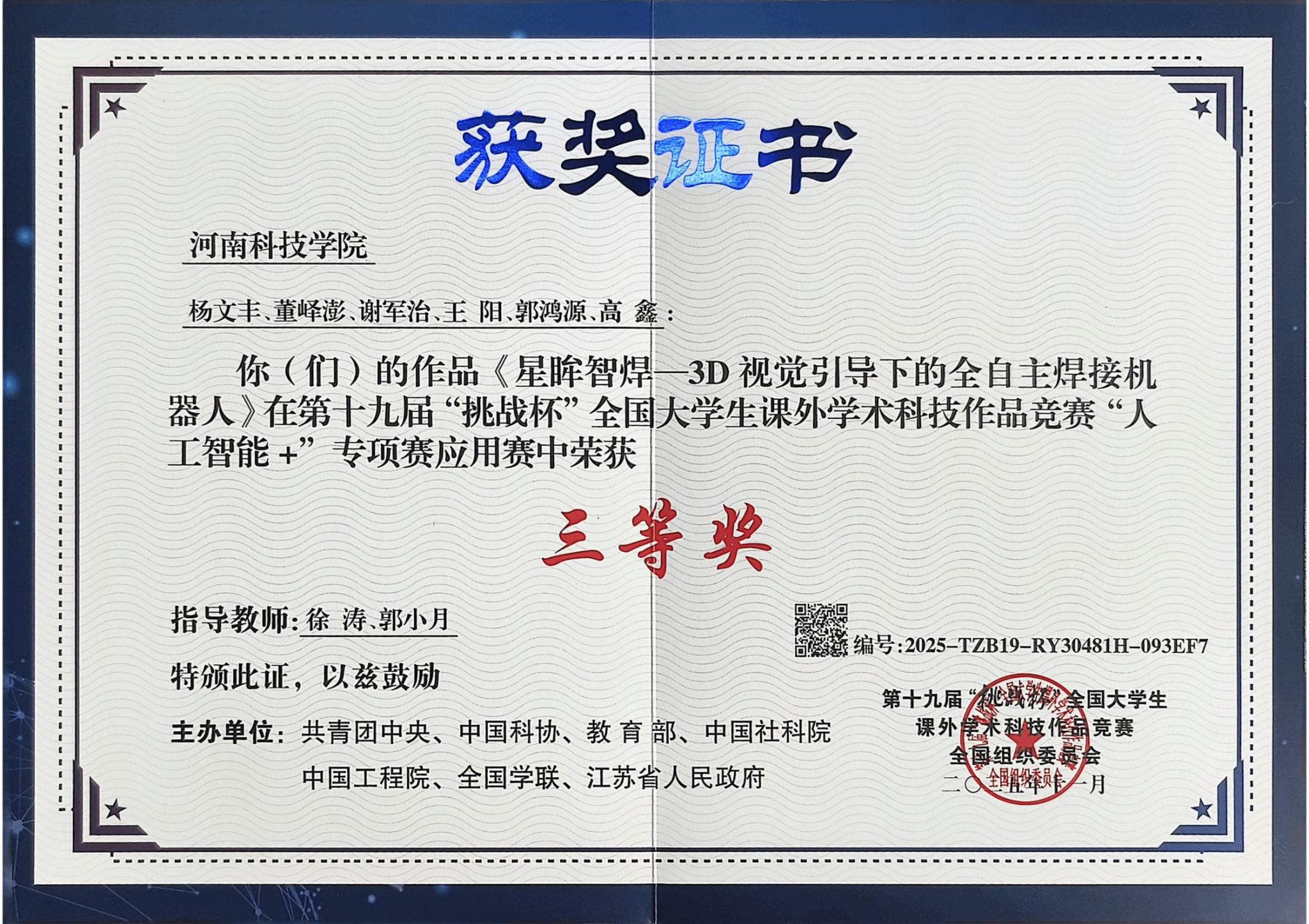 日前,由共青团中央、中国科协、教育部、中国社会科学院、中国工程院、全国学联和江苏省人民政府共同主办的第十九届“挑战杯”全国大学生课外学术科技作品竞赛落下帷幕,本次竞赛设主体赛、“人工智能+”专项赛、“揭榜挂帅”专项赛等赛道。我校计算机科学与技术学院《基于时空耦合物理引导的新能源汽车电池管理系统》获得“人工智能+”专项赛二等奖,人工智能学院《“庖丁解猪”——猪类胴体自主分割机器人》《星眸智焊---3D视觉引导下的全自主焊接机器人》获得“人工智能+”专项赛三等奖,实现了我校在“挑战杯”国赛中获奖数量的突破。此前,由共青团河南省委、河南省教育厅、河南省社会科学院、河南省科学技术协会、河南省学生联合会共同举办的2025年“挑战杯”大学生课外学术科技作品竞赛结果揭晓,我校获一等奖3项、二等奖13项、三等奖17项,成果丰硕。