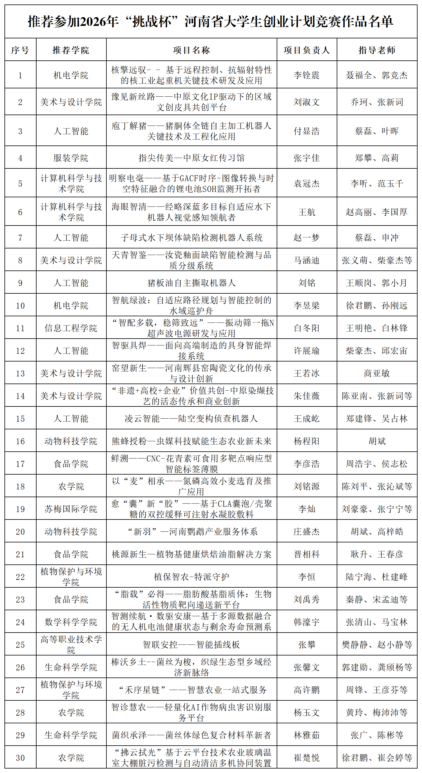 为进一步引导青年学生在参与创业实践活动过程中树立创业精神、提升创业素质,努力营造浓厚的大学生创新创业氛围,校团委面向全校举办了2026年“挑战杯”大学生创业计划竞赛。经过校级初赛、决赛,评选出优秀作品共30项,拟推荐参加2026年“挑战杯”河南省大学生创业计划竞赛,现将作品名单公示如下。公示时间自2026年4月21日-4月25日,共5天。如有异议,请在公示期间及时反映。